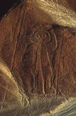 I think they were drawn to show other visitors to our planet some of the creatures that live on our planet. That seems like the logical purpose for these drawings. Remember some of these drawings are so large that they cover over 1 mile. Another amazing feature of these lines is that many of them are drawn with only 1 line that doesn't end, it is a continous line. These landscape artists surely had some anti gravity crafts to see these pictures from above. Here is another drawing of a person, which may or may not be made in the image of a human. Notice his big eyes.